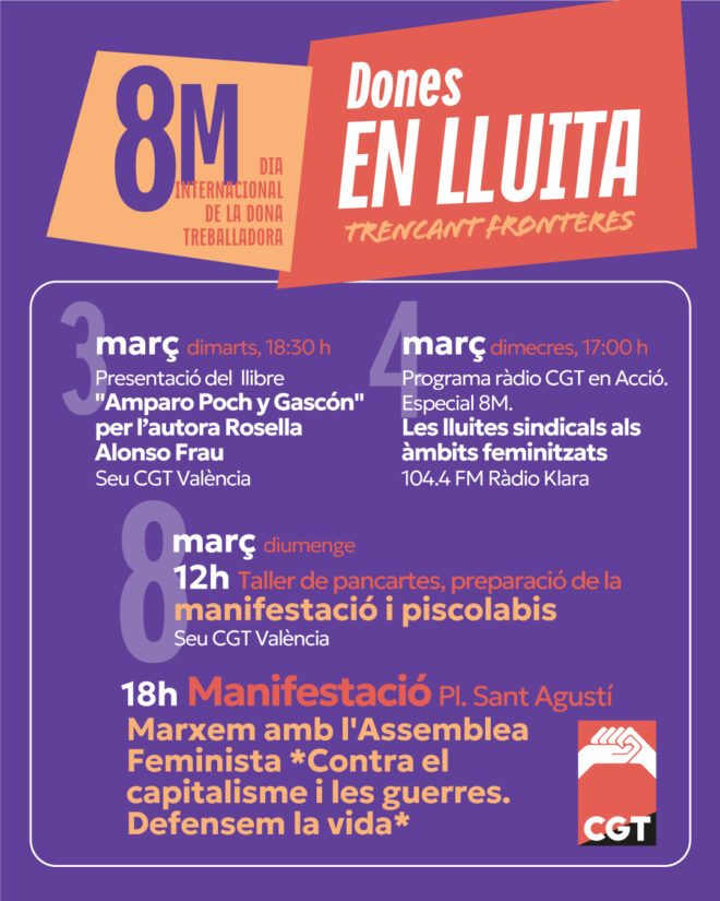 - Dimarts 3M 18:30 hores: Presentació del Llibre “Amparo Poch y Gascón. La ciència i la paraula al servei de la revolució” A càrrec de l’autora Rosella Alonso Frau. CGT València. Av. del Cid, 154