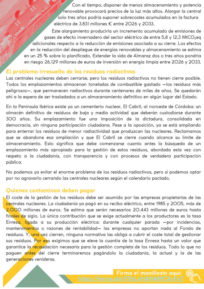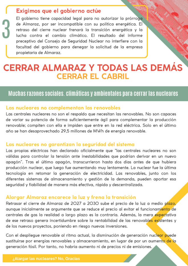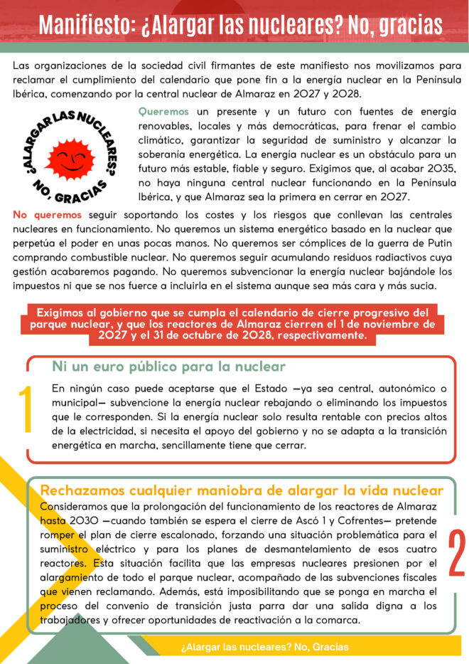 La energía nuclear es un obstáculo para un futuro más estable, fiable y seguro. Exigimos que, al acabar 2035, no haya ninguna central nuclear funcionando en la Península Ibérica, y que Almaraz sea la primera en cerrar en 2027.