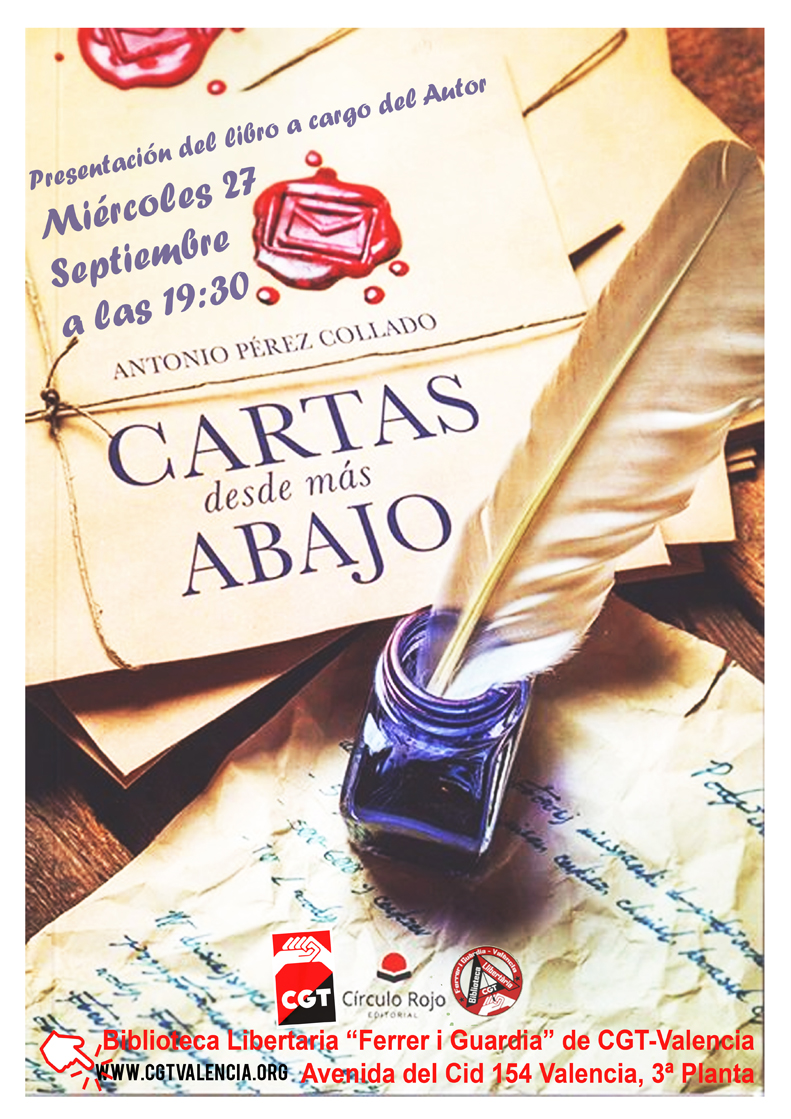 Miércoles 27 de Septiembre a las 19:30. Presentación del libro a cargo del Autor. Biblioteca Libertaria “Ferrer i Guardia” de CGT-Valencia. Avenida del Cid 154 Valencia, 3ª Planta. ¿Qué es CARTAS DESDE MÁS…