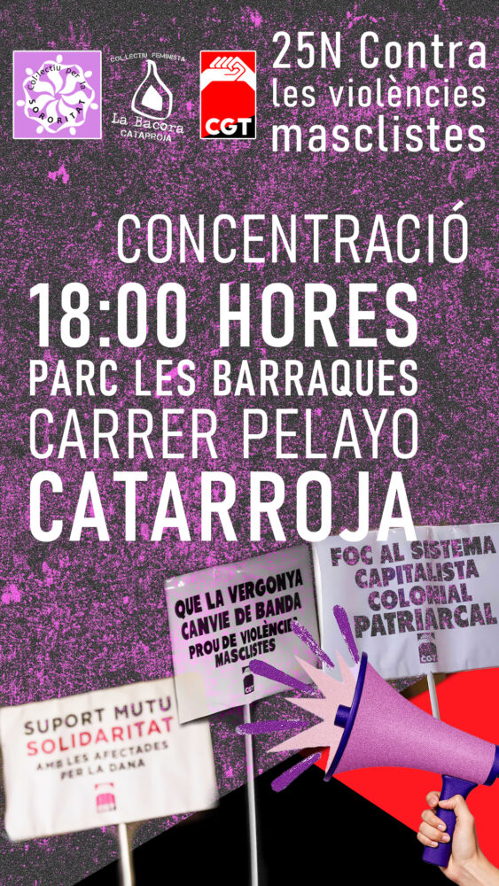 La Confederació General del Treball (CGT) de València es concentrarà el dimarts 25 de novembre, dia internacional contra les violències masclistes, al Parc “Les Barraques” de Catarroja junt amb els col·lectius Per la Sororitat i La Bacora. L’organització anarcosindicalista exigeix «posar el focus en els agressors i no en les víctimes de les violències masclistes, reivindiquem la fi de totes les formes de violència, alcem la veu per les que ja no estan amb nosaltres i volem ser llavor d’un món nou” afirma Carme Jareño, secretària de la dona de CGT València.