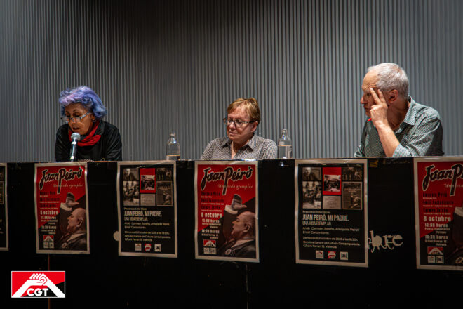 Miércoles 8 de octubre 18:30 horas Presentación del libro «Juan Peiró, mi padre. Una vida ejemplar» escrito por José Peiró Olives, hijo de Joan Peiró. Participará Amapola Peiró, nieta de Joan Peiró, Emili Cortavitarte, presidente de la Fundación Salvador Seguí y Carmen Jareño, Secretaria de la mujer de CGT-València. El acto se realizará en el Octubre Centre de Cultura Contemporània, situado en la calle de Sant Ferran, 12 de València.