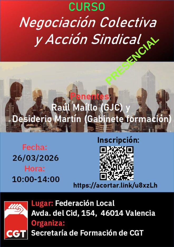 Este curso de formación va dirigido a todas las personas afiliadas al sindicato y sobre todo a aquellas compañeras y compañeros que son delegados y delegas de nuestra organización. El curso de «Negociación Colectiva y Acción Sindical se realizará el 26 de marzo de 2026 de 10:00 a 14:00 horas en nuestra sede sindical de la avenida del Cid, 154 de València y estará impartido por Desiderio Martín del Gabinete de formación y Raúl Maíllo de Gabinete Jurídico Confederal de CGT.