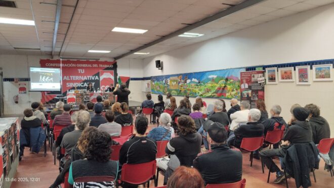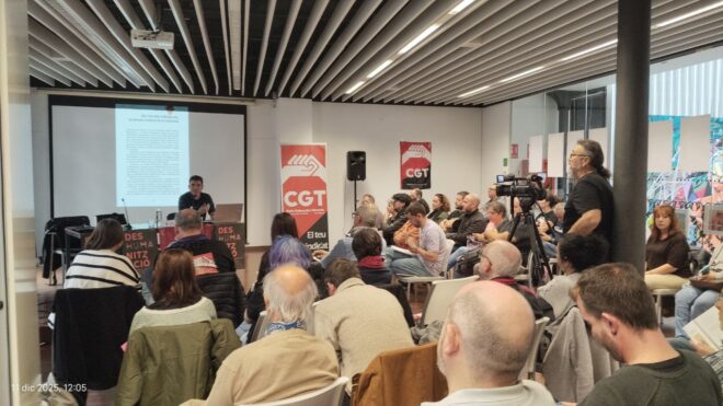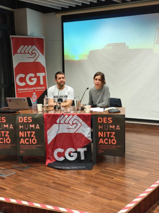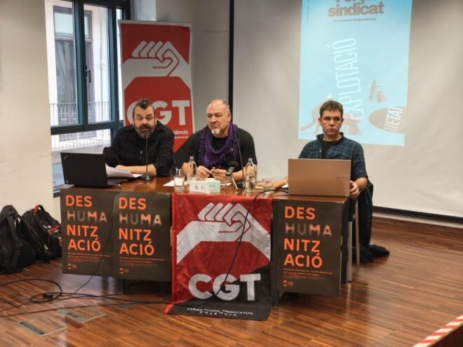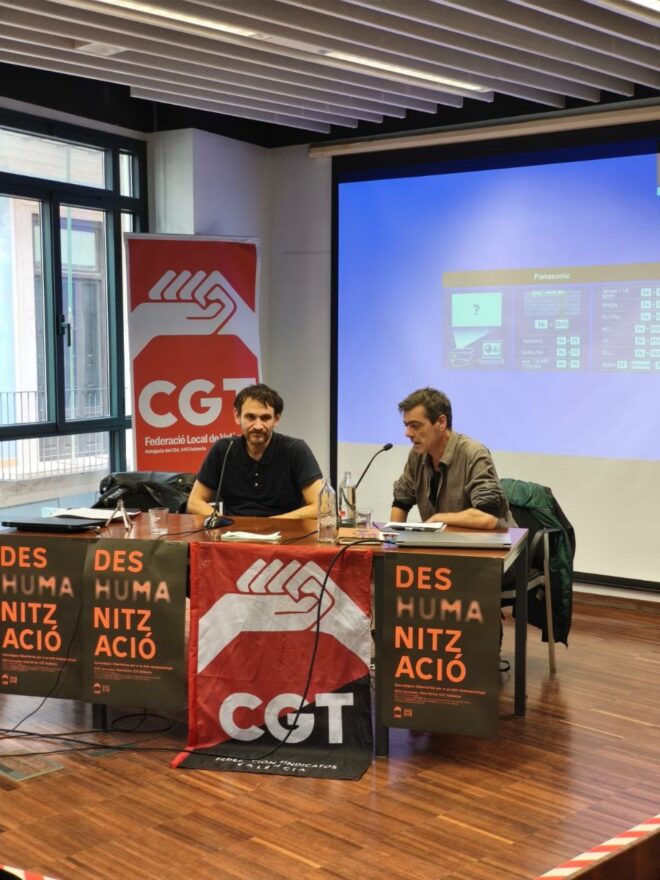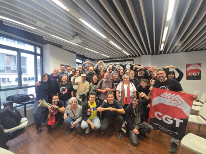 Les Jornades llibertàries que organitza la Federació local de València de la Confederació General del Treball (CGT) han començat el dijous 11 de desembre en l’Octubre Centre de Cultura Contemporània amb les intervencions de Juan Miguel Font i Juan Ramón Ferrandis, secretaris generals de la Federació local de València i de País Valencià i Múrcia respectivament, que han donat la benvinguda a les assistents i han donat pas a una assemblea de delegades i afiliades de CGT que ha comptat amb la presència d’Iru Moner, secretari d’acció social de CGT Catalunya, i s’ha centrat en analitzar les estratègies sindicals en el centre de treball.