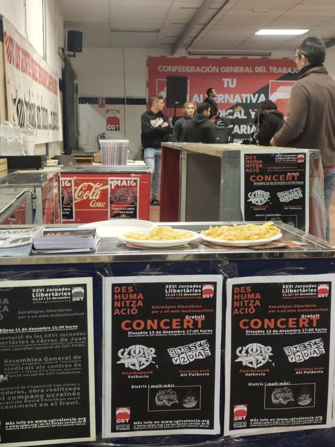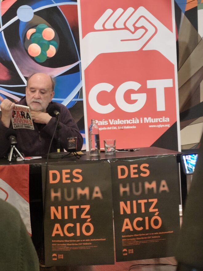 Enguany les Jornades Llibertàries que tenen com a lema “Estratègies llibertàries per a un món deshumanitzat” han sigut reduïdes a tres dies “amb motiu de l’alt ritme de mobilitzacions exigint responsabilitats per la gestió criminal de la DANA i contra el genocidi en Palestina”. El divendres 12 de desembre arribarà el torn de Carlos Taibo qui presentarà a les 18.30 el seu llibre “Anarquía para jóvenes (y para quienes no lo son tanto)”, una introducció ràpida i pedagògica a les idees anarquistes i llibertàries, subratllant que les societats poden i deuen organitzar-se des de baix, des de l’autogestió i el suport mutu, al marge de fórmules autoritàries i el dissabte 13 de desembre les jornades es traslladen a la seu de CGT València (Avinguda del Cid 154), començant a les 11.30 amb la xarrada de David Vila Diéguez, músic, cineasta, crític cultural, doctor en Estudis Hispànics per la Vanderbilt University (Nashvile, els EUA) amb una tesi sobre el punk espanyol i professor en el departament de World Languages and Cultures en la Universitat de l’Estat de Califòrnia, que presentarà el seu llibre “Punk espanyol: Cridant per la democràcia en un estat postdictatorial”, un menjar per als assistents que l’hagen comunicat a l’organització i a les 17h es tancarà les XXVI Jornades Llibertàries amb un concert gratuït de les bandes C.O.R. (anarcopunk des de València) i 8 mesos i 2 dies (versions punk des de l’Alt Palància).