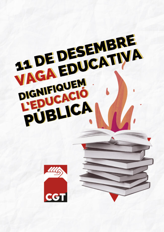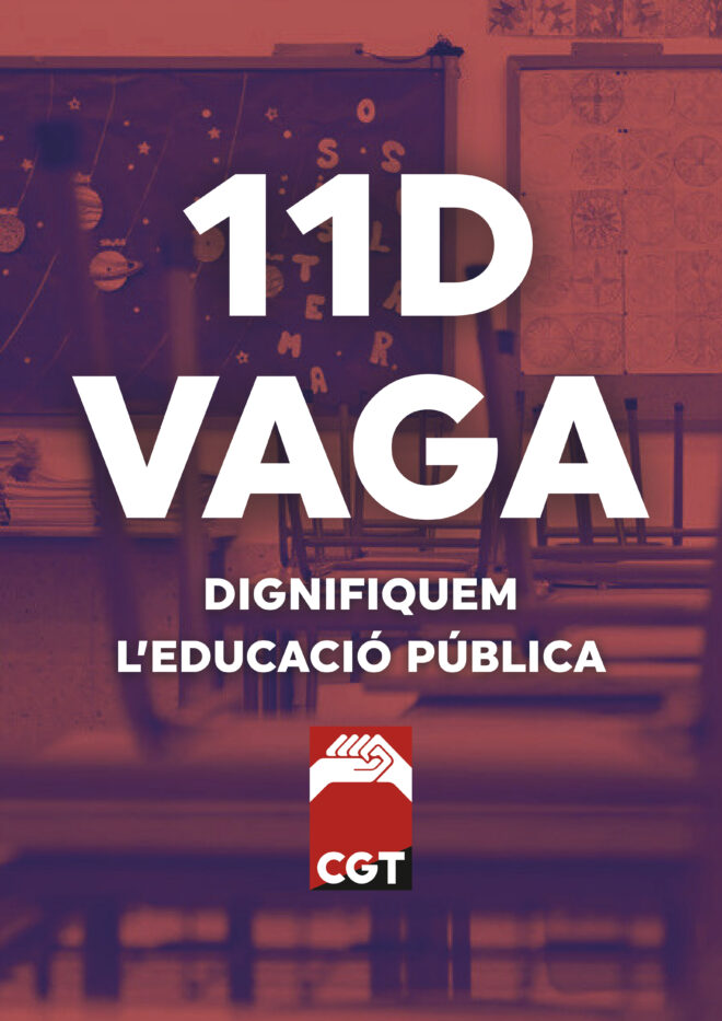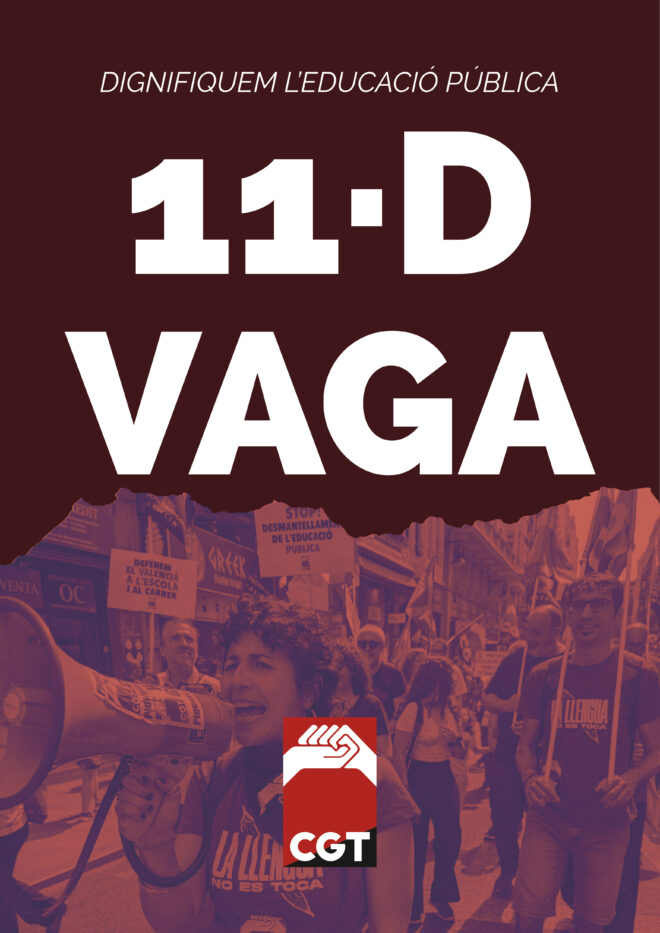 La Secció Sindical d’Ensenyament de la CGT València dona suport a la vaga educativa del proper 11 de desembre i al cicle de mobilitzacions que s’enceta amb aquesta convocatòria. El nostre sindicat hi acudirà amb un seguit de reivindicacions compartides amb la resta de convocants i amb altres de pròpies i amb el ferm propòsit de defensar una dignificació de la tasca docent.
