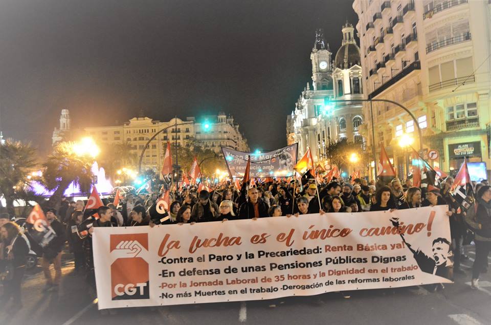 La Confederació General del Treball (CGT) va mobilitzar a la tarda del divendres 16 de febrer a més de 2.000 persones als carrers de València per marxar contra la precarietat laboral i els abusos empresarials, contra les violències masclistes, contra la precarietat laboral, en defensa d’unes pensions públiques dignes, en defensa dels serveis públics, per la jornada laboral de 35 hores, per la derogació de les reformes laborals del PSOE i PP, i per la recuperació de drets de la classe treballadora perduts en els últims anys.