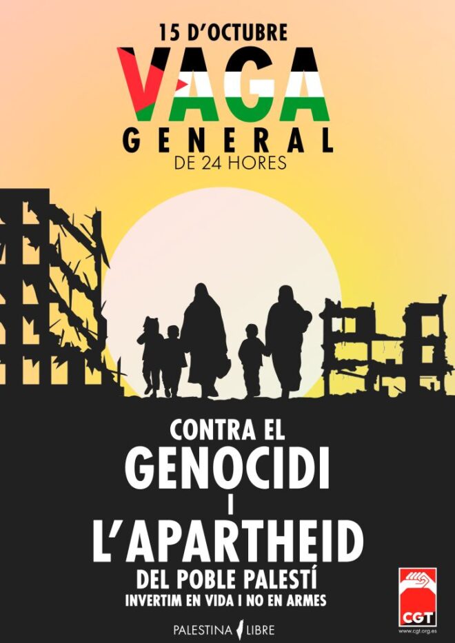 Des de CGT València es fa una crida a tots els treballadors i treballadores al fet que secunden la jornada de vaga del pròxim dimecres 15 d’octubre “és el moment que la classe treballadora mostre la seua oposició a la guerra, a la mort, a l’assassinat de xiquets, xiquetes, dones i homes, tots ells responsables de l’únic delicte d’haver nascut en el lloc i temps equivocat”. El sindicat llibertari ha anunciat que es posarà en contacte “amb la resta d’organitzacions socials i sindicals perquè la vaga i jornada de lluita siga un èxit”. En eixe sentit ha recordat que el 15 d’octubre està previst el partit d’Eurolliga entre el València Basket i el Hapoel de Tel-Aviv “òbviament serem a les portes del Roig Arena denunciant la utilització que des d’Israel es fa de l’esport, el sportwashing no pot ocultar el genocidi i les violacions de drets humans que cometen sobre Gaza”.