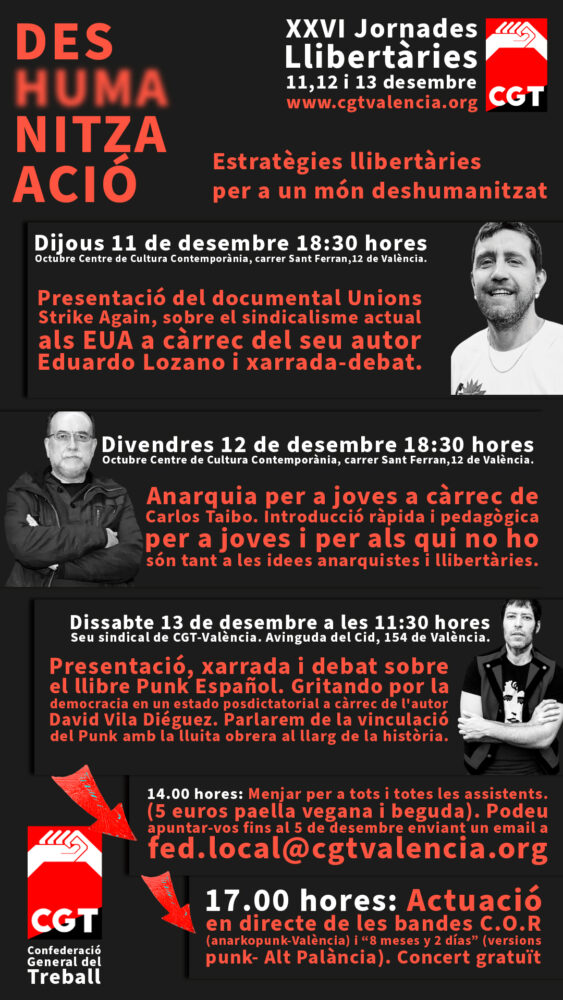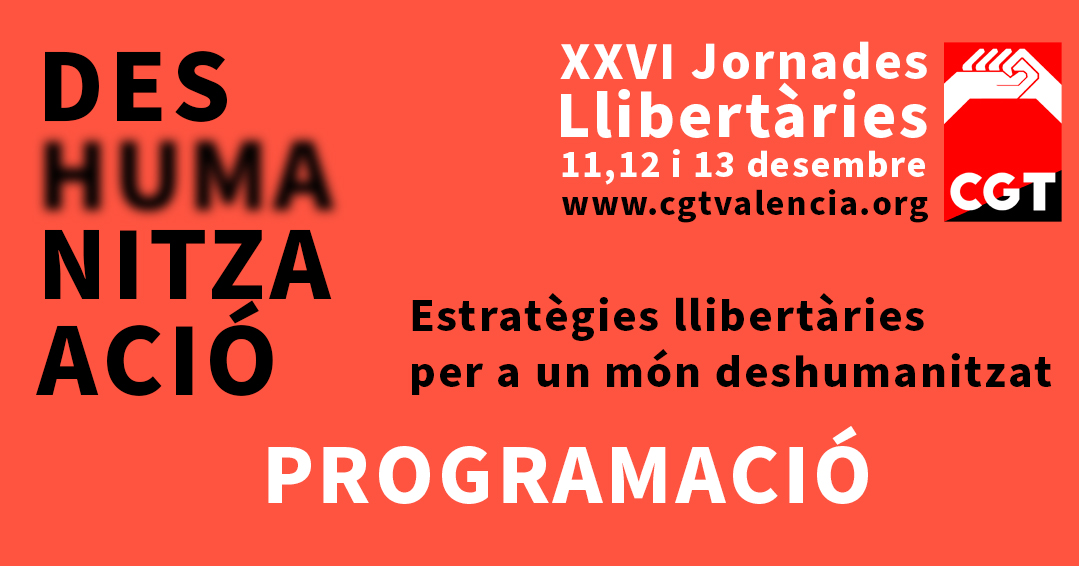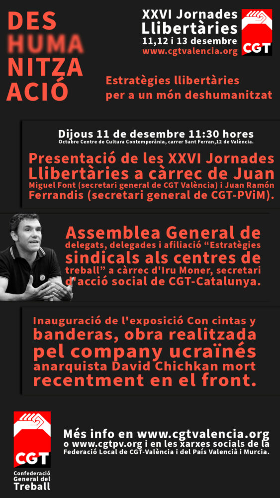 11.30 h. Presentació de les XXVI Jornades Llibertàries a càrrec de Juan Miguel Font (secretari general de CGT València) i Juan Ramón Ferrandis (secretari general de CGT-PViM).