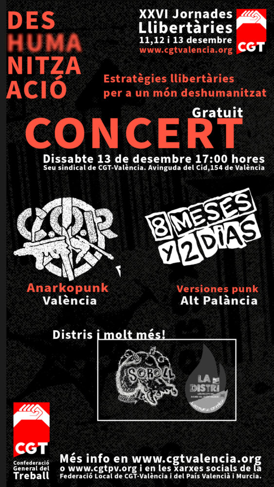 17.00 hores: Actuació en directe de les bandes C.O.R (anarkopunk-València) i “8 meses y 2 días” (versions punk- Alt Palància). Concert gratuït.